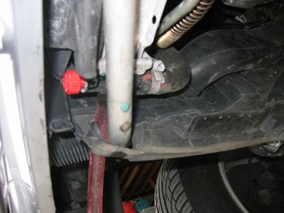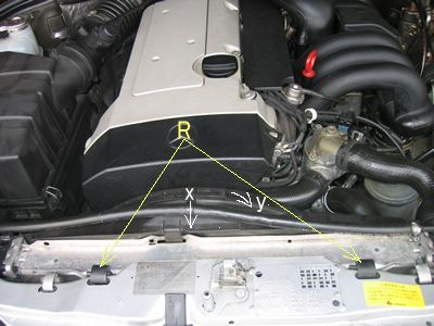 ACコンプを取り出すスペー スが厳しそうだったこととACコンデンサーのラジエター側の漏れを確認したかったの でファンシュラウドとファンも外しRのクリップを抜きラジエター外す準備。 下から見るとコンプを取り出すには配管を外してから前方に動かしスタビライザーとエアコンコンデンサーの間から下に降ろすしか方法はありません。(スタビライザーを外すという手もあります) |
