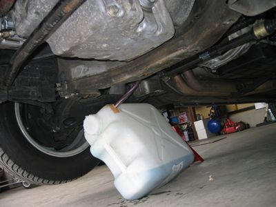 シリンダーブロックからもLLCを抜く これ専用のポリタンクです。ホースが入るだけの穴を開けています。 |