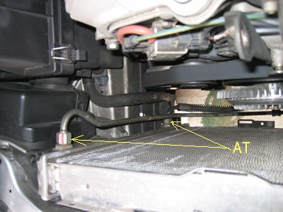 3本のラジエターホースとエキスパンションタンクに行っている細いホースを外したらATオイルクーラーの配管も外します。ラジエターを壊さないよう2本のオープンエンドレンチで緩める。フレアーがあれば理想です。 |