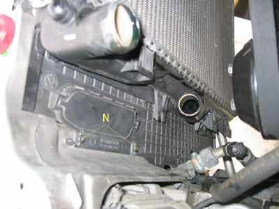 ラジエターと車体の空間を埋めるパネルも外します。「N」のファスナーは消耗品と考え折れても気にしません。 |