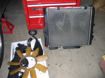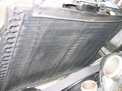 取り出したラジエター。ATオイルのラインをすぐに塞ぎ(傾けるとATFが出てきます)冷却の為のフィンを曲げないように洗剤でよく洗った。 内部も高圧の水道で流しました。(中は固着したものも無くとってもきれいでした。) |