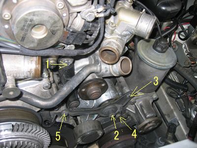ベルトを緩める前にウオポンとパワステのプーリー固定ボルトを緩めておきます。 「2」を緩めてからベルトのテンションを開放しベルト>ウオポンとパワステのプーリー外すとこの状態。(締め付けは75Nm) 「1」はショックアブソーバーの固定ボルト(締め付けは21Nm)