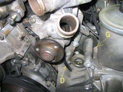 ベルトタイトナーを外したところ。「D」はウオポンのドレンパイプ(下にあるケースに受けて絶対たれ流しにしない姿勢ですね) 「G」の裏側からもボルトがあり(2面幅13mm)外すとパワステポンプが動かせる。