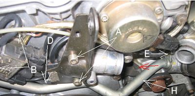 ヒーターからのリターンホースHも外す必要があります。Aのボルト#6 IN-Hex2本外しBのM6ボルト(2面幅10mm)2本も外します。するとDのあたりにある#5In-Hexにアクセスできるので外します。EはM6ボルト(2面幅10mm)1本で止まっています。 DとEを外せばHのリターンホースは赤い矢印方向に抜けますので針金などでエキゾースト方向にしばっておきました。ここのOリングもウオポンに付属。 |