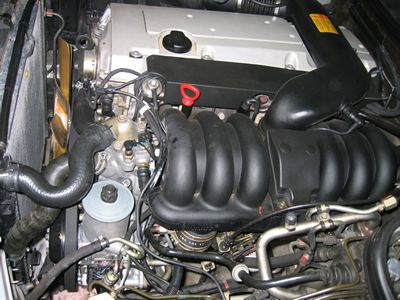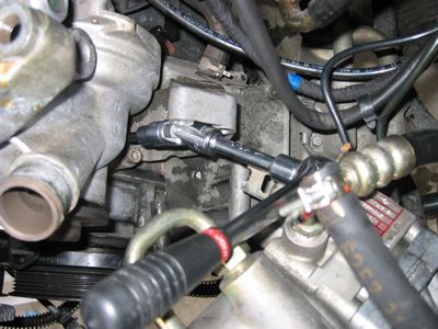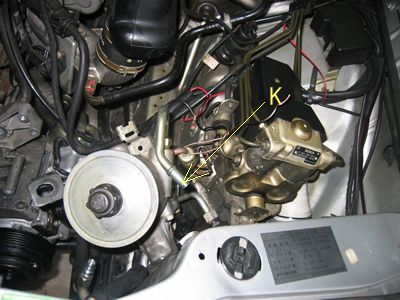 パワステポンプは「K」のホースのみ外し針金でこの位置に固定 これは、その後O/Hしました。 |