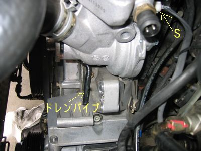 「S」は例の水温センサーSW。配線の長さは350mmほどで車体側のコネクターに届きました。 あらかじめポンプに取り付けておくほうが簡単ですがウオーターポンプのセンサーを外してしまえば狭いながらも手が入り取り付けは可能かもしれません。(未確認) すぐにサーモスタット、同カバー、ドレンパイプも忘れずに付けます。(サーモスタットを付ける前に中に物を落としたら大変なので・・)