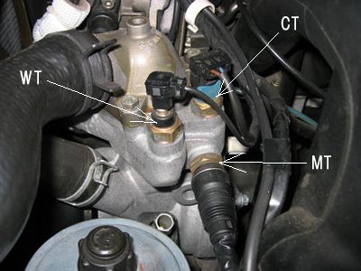 新しいウオーターポンプを取り付け。シリンダーとの合わせ面に使うOリングには脱落防止と漏れ対策のため薄く液体ガスケットを塗りました。(ワコーズのガスケットメイク) 画像はウオポンを外す前のものです WTは水温計用センサー(メーターパネル)用 CTは電動ファン制御用センサー MTはモトロニックへのセンサー #95年モデルで過去ウオーターポンプ交換されていない場合はMTには穴がありません。