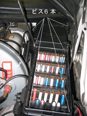 とりあえず新しく付けたセンサーSWの配線を抜き車体側配線をくっつけてもファンは回らず・・・ ここでリレーを疑います。フューズボックスのフタを外しビス6本外せば・・・その下にリレーがいくつか。 |
