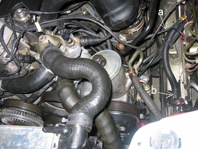 水温センサーSWからの配線「a」は「b」のあたりで車体側と接続。 |