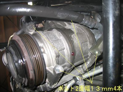 配線のコネクターを抜きコンプ本体の固定ボルトM8 2面幅13mm 4本を緩むことを確認。締め付けは23Nm±2.3Nm ラジエター外してあるのですんなりと下に降ろせました。 ACコンプは迅速に交換しなければ湿気が入ってしまうので最初にリビルド品のチェック。 全体には新品と見間違うほどキレイでマグネットクラッチ・プーリーも塗装されているが 配線がちょっと古い感じ・・これが後で大変なことに・・・。 サクションライン取り付け部分から内部のコンプオイルを逆さまにして出してみると マニュアルの指定量と同じ120mlほど出てきたのですぐに戻しフタをした。(オイル注入は必ずD側から) コンプからたれているオイルはパワステポンプから・・・あらかじめウエスを敷いておくべきでした。