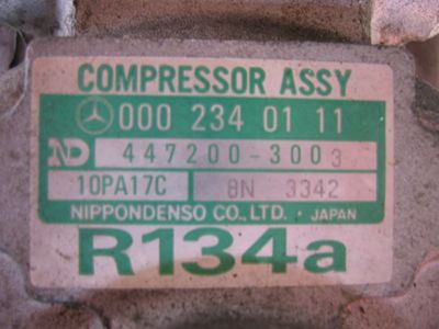 A/Cコンプレッサーお尻に付いているプレート 000 234 01 11 はコンプ本体の品番でマグネットクラッチが付いたAssyが000 230 05 11 となるようです。 10PA17Cはデンソーの呼び名で「10PA」は10気筒(5 double piston swash plate compressor ) 「17C」は170ccの容量を表しているようです。 詳しい構造は「nakaさんのページ」にあります。