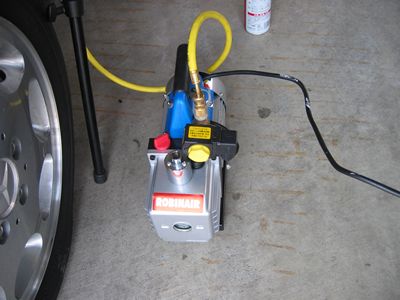 いよいよ真空引きです 気温が低いのでポンプを5分ほどカラ運転しウオーミングアップ。その後各ホースの接続部分Oリングにはコンプオイルを塗布し装着。ゲージの中央、黄色のホースに真空ポンプを接続しスイッチON 最初はゲージのバルブを微開。3分ほど経過したら徐々にバルブを開け全開の手前まで開けます。 ホースの接続部分ネジを増し締めしながらゲージを観察。