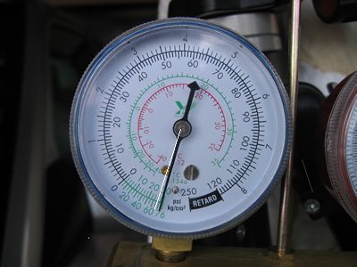 低圧側ゲージ ここまでになるのに40分ほど 針の位置を記憶しゲージのバルブを閉め8時間経過したら白線のところまで針が下がりましたがこの程度ならばOKとしました。 真空ポンプの説明書によると10分ほどゲージを見て負圧が維持できていればOKとのこと。 冷媒を400gほど注入し(必ず低圧側から・・・サービス缶を40℃ほどのお湯で温めながら絶対に逆さまにしないで気体で充填します) 一度エンジンをスタートしコンプを回してから再度真空引き(反復真空引き)しようとしたのですが・・・ エアコン操作パネルで「温度最低」「ブロアーファンON」してもコンプレッサーが回りません!困りました。 さあ、この続きは・・・・ |