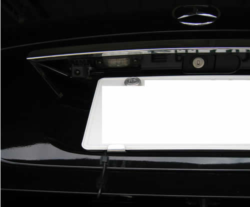W126の時代から比べればリアデッキも高くなっていて後方の視界が見にくいのは現代の流れです。 矢印がカメラの取り付け位置です。 |
