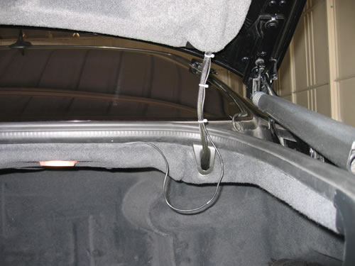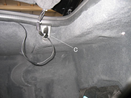 トランクリッドの内装材も慎重に外し配線をはわせました。 スプリングで引き込む手の込んだ作りなのでカメラ配線は画像のように途中までタイラップで止めてそれ以降はフリーにしました。 A-Bのあたりがトランク閉めるとき引き込まれる部分です。 この画像はトランク全開です |