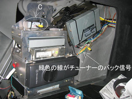 パナソニック:取り説の「お客様相談センター」へ電話で問い合わせたところチューナーから出ている緑の線をバックランプの+に繋がないと画像が切り替わらないとの説明。これは説明書に書かれていなかったので未接続。これが原因でした。 この手の相談センターは電話が混み合っていて中々繋がらないのですがパナソニックはすぐに繋がり説明の的確で大変助かりました。 Cはカメラコントロールユニット。スポンジで振動対策してタイラップで固定しました。