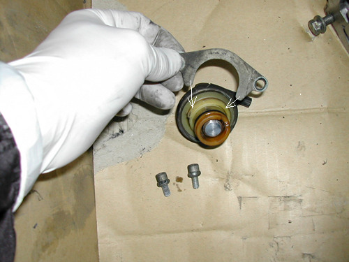 2本のボルト外したら矢印あたりを対角線状にこじればバキュームボックス抜けてきます。 |