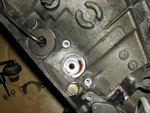 抜いた後の穴・・奥の上下にオイルの通路らしきものが見えますので外すまえに向きを確認したほうがいいようです。