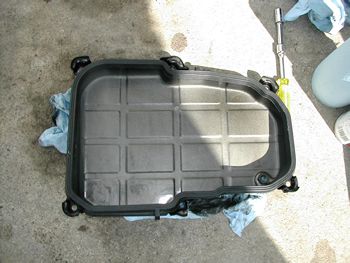 水平な場所でコンバーター+オイルパンから抜いて。フィルターも交換します |