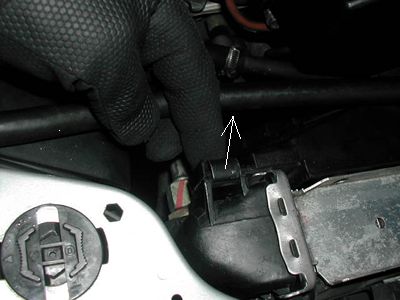 ラジエター左側 ラジエターホースTOPの下にあるツメを持ち上げる |