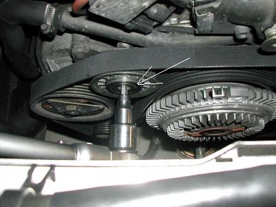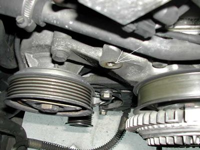 矢印はアイドラープーリー固定ボルトの穴・・ベルトを外したところ(M8) |