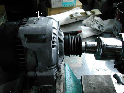 本体をバイスに固定して分解。プーリー固定ナット(22mm)はインパクトレンチで緩めました。腕力だけでは緩まないほど固いです。シャフトのセンターはスプラインの10mmでした。 本体ケースは前後に2分割しますので矢印部分あたりに合いマーク付けておきます。 BOSCH 0 123 335 002 KC>14V 45-90A メルセデスのP/N 0091540202 |