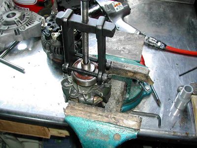 インナーローターをバイスではさみ固定 フロントプーリー側 大きいベアリングを抜きます。わりとすんなり抜けました。 |