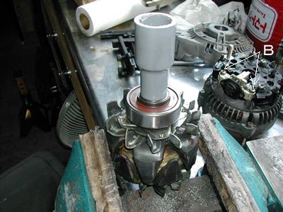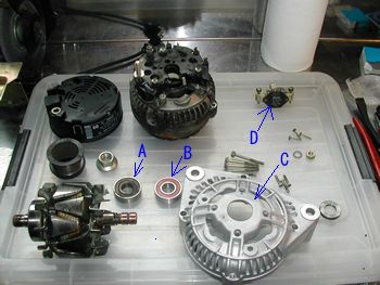 新しいベアリングの取り付け。本来ならプレスで挿入するのが正しいのですが水道配管を使い打ち込みました。(ベアリングのインナーレースにサイズがぴったりのを見つけました。アウター側を打ち込むのは絶対やってはいけません) レギュレーターカットアウトはBのボルト2本外すと取り出せます。 |
