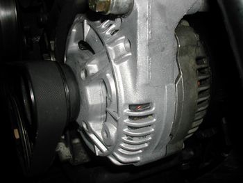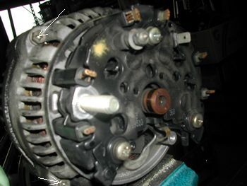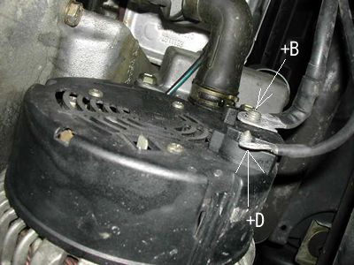 オルタネーター裏には配線が2本固定されていて13mmと8mmのナットをゆるめるだけです。 |