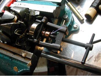リア側 スリップリング(矢印)磨耗のチェック。段付きなどあれば旋盤にて修正が必要。また作業時ここにキズなど付けぬ様細心の注意。 ベアリングリア側小さい方がゴロゴロと音が出ていて要交換と思われます。 アマチュアープーラーでベアリングを抜きますが矢印のエボナイト部分を破損しないよう注意が必要です。幸いプーラーの先が細く中心のくぼみにうまく入り抜くことが出来ました。新しいベアリングを注意深く打ち込みました。