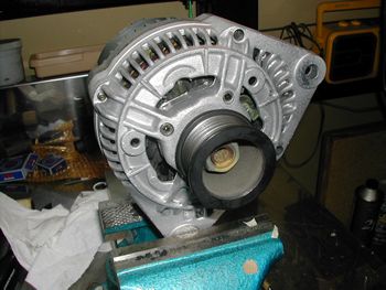 組み立て完了した様子。きれいになって気持ちいいです。 組み立ては分解の逆手順ですが本体ケースの合いマークを合わせること プーリー固定のナットはセンターを10mmのスプラインで押え22mmのディープメガネレンチで締めました。規定トルク80Nm ブラシのある側のリアケース・・ブラシを痛めない為にレギュレーターカットアウトは最後に取り付けます。 組み立て後気づいたのですがインナーローターにプーリー側ケースを取り付けた後バイスで固定してからプーリーのナットを締めれば確実にトルクをかけることができます。 |