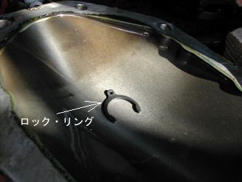 抜いたロック・リングとエンドカバー(このエンドカバーはアルミでした) ロック・リングは左右で2個使われています。結構肉厚でキツくはまっていますので抜けた拍子に ピーン!と飛んで行ってしまいました。後で思ったのですが穴にワイヤー通して抜くことも可能ですね。 |