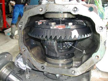 ここからの作業はデフ本体を専用スタンドに取り付けるのがベストですが作業台に乗せ手で押さえてもらいました。 エンドカバーは10mmのトリプルスクエアーで緩め外し、次にAの部分にあるロックリングをフックを引っ掛けて抜きます。 これでコネクティングフランジ(ドライブシャフトと繋がっているところ)が抜けます。