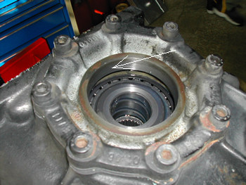 まず、用意した新品シールと同じ物か確認をし、同一と判断出来ましたのでシールの取り外しにかかります。 矢印部分にキズをつけないよう注意しながらプライバーでオイルシールを抜いたところです。中にテーパーローラーベアリングが見えます。 |