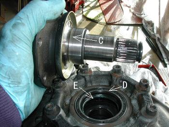 コネクティングフランジのC部分はオイルシールの当たり面ですが#800の耐水ペーパーで面を整えます。 Dは打ち込んだオイルシール。このオイルシールは径65mmですから、ほぼ同じ外径の工具があればいいのですが今回はアルミのブロックをあてがい叩きました。丁度クボミに入ってカンペキに打ち込むことに成功! 間違って購入したASR付き車両用サイドシール(014 997 72 47)は外径93mmですので打ち込む場合の参考までに。 Eはシャフトと当たるオイルシールの命部分(リップ)ですがベアリング用グリスを薄く塗布。(マニュアルではハイポイドギアオイル塗布となっています) コネクティングフランジを元通りにはめ込みロック・リングを嵌めます。ここはラジオペンチ(先のギザギザが減っていない新しいものがあれば最高)で挟み押し込みました。 ロック・リング(115 994 04 34)はしっかりと弾力があったので再利用しましたが新品を準備しておけばと反省しました。