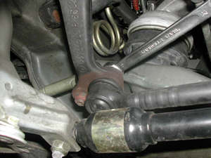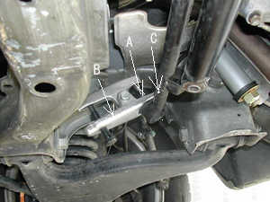 ボールジョイントプラーを取り付けます。 ここからは「はじめさん」にやっていただきました。一気に外れ工具が飛ぶと危険なのでB,Cの部分をロープで縛りプラーのボルトを締めた後A部分をハンマーで一撃!パキーン!と音がして見事外れました。 |