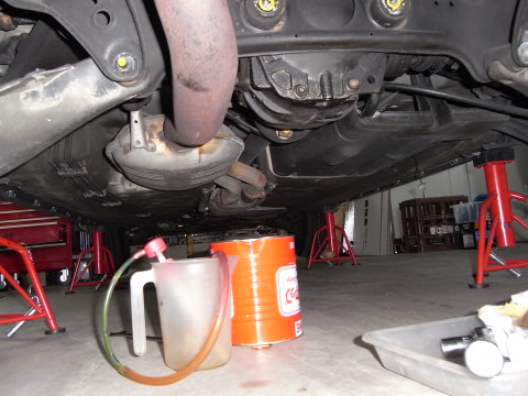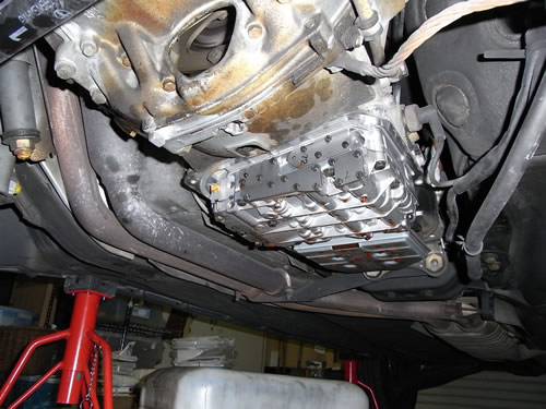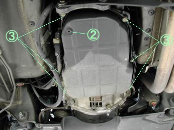 水平な場所でコンバーター+オイルパンから抜いて。フィルターも交換します オイルパンドレンから抜いたら再びドレンボルトを締めたほうがBを外した時オイルがこぼれずに作業できます。 |