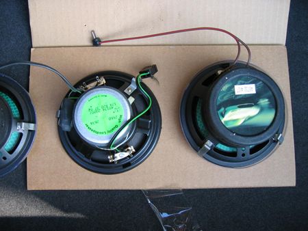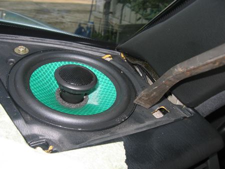 ボロボロでベタベタするスポンジは捨ててエアガンで吹ききれいにして組み立て ここで音を出しヘッドユニットのイコライザーで音質調整しボリューム上げたらドアのウーファーからビビるような歪みを感じました。 |