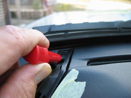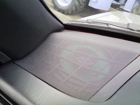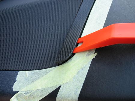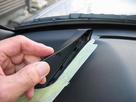ダッシュボード上のスピーカーグリル外します。 内装にキズつけないようマスキングしてますここをこじると細いパネル外れます。 ダッシュボードはヘコミやすいのでテコの要領で力を加える時は下な何かあてがうといいです。 |