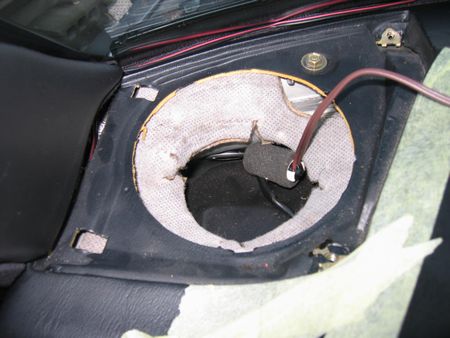 外した後のアナ 白く見える吸音材が邪魔になって(純正よりマグネットが大きいので)付けにくい場合は適せんカットします。 |