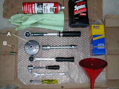 A、は純正オイルフィルターレンチ、頭は22mmのBOXレンチで回します