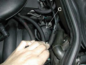 6、ドレンボルトからオイルを抜きオイルフィルターも交換 (フィルターはエンジン左バルクヘッド前の(C)です。(A)の専用レンチ+22mmBOX+エクステンションで回します。締め付けトルクは20−25Nm。この時フィルターに同梱されているOリングもオイルを塗布し交換します。