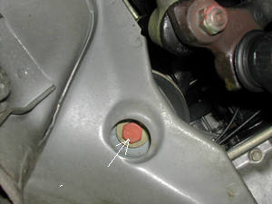 最初にエアークリーナーケース、エキパイのヒートシールド、更にエンジン前部のファンシュラウドを外します。 矢印は右のマウント 2面幅17mmボルト。締め付けトルクは55Nm