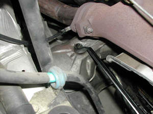 右マウント上のボルトはBETAのディープオフセットが丁度良く 緩みました。 ここで、更にリフトを下げスペースを多く作ります。(取り出すスペースを作るため) こちら側は下から「アイドラーアームブッシュのところにあるヒートシールドを外し取り出しました。 |