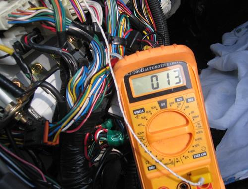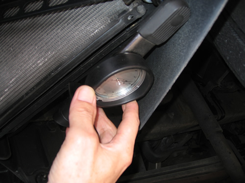 ようやくサービスポートを見つけゲージマニホールド取り付けエンジン始動。しばらくして、よーく観察すると高圧側が上がったり下がったり。