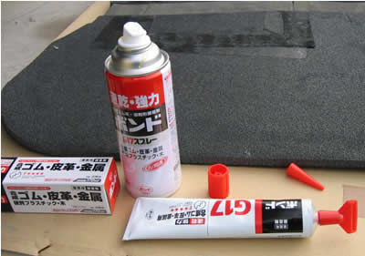 接着剤 G17 スプレーは\1030 チューブは\470 背景はこれから貼るフードインシュレーター。こちらはチューブ入りのG17に幅広のノズルで塗布しました。 |