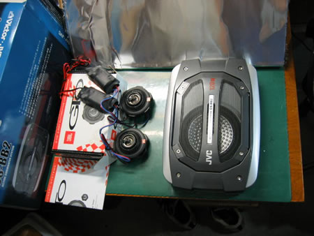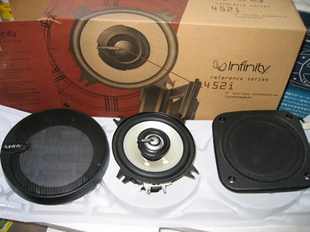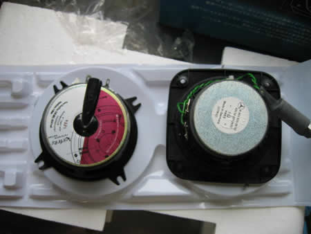 左: 新しく取り付けるインフィニティ10cmコアキシャル2ウエイ これは1set\6800- グリル付き 右:外した純正 |