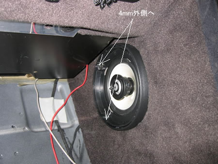 純正取り付け穴にあわせるためスピーカグリルの外側4mmほど穴を広げたらバッチリでした。 ここで音を出してみると・・・低音も結構出ています。 うーん。いいかも。 |