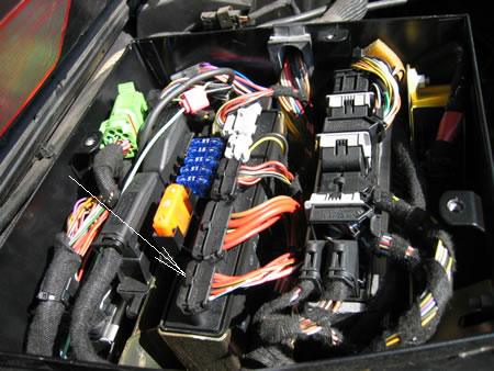 内部は5個のリレーが入っていました。これが装着されている場所は下画像、矢印のBOXです。