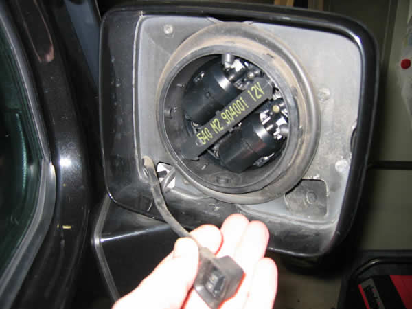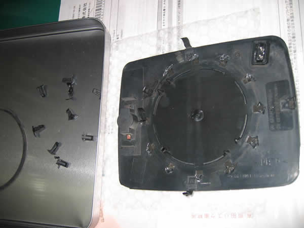 この作業をしていた時Gの助手席ドアを閉めたところドアミラーのレンズ(ガラス)がポトリと落ちました。幸いヒーターの配線でぶら下がり地面に落ちて割れることだけは免れましたが・・・。